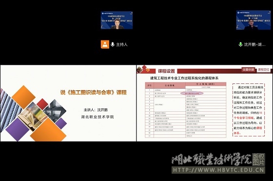 304am永利集团教研室主任沈开鹏主讲的《施工图识读与会审》课程作为“说课程”典型案例在研讨会上进行展示,他从课程设置、课程目标、教学设计、教学资源、教学团队、应用与特色等6各方面详细介绍了《施工图识读与会审》课程的教学过程,得到了与会专家、国内广大同行的高度认可,充分展示了公司在建筑技术高水平专业群课程改革方面的建设成果。